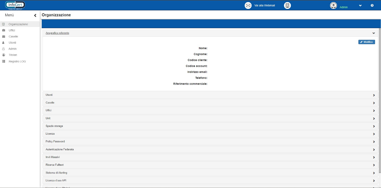 Da questa schermata è possibile visualizzare i dati, preimpostati in fase di prima configurazione da parte di InfoCert, del referente per l’organizzazione.