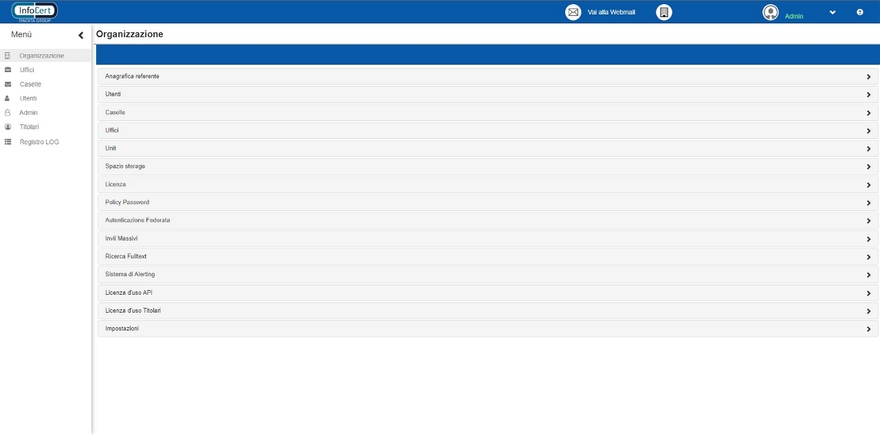 Il logo InfoCert, in alto a sinistra, permette di riportare l’utente in questa schermata in qualunque momento, fungendo da tasto “home”. In alto a destra è presente la User ID dell’utenza Admin dove è possibile effettuare il cambio password ed il logout.