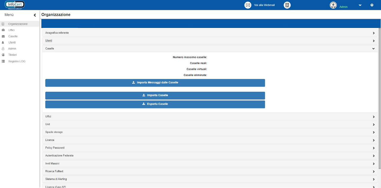 Permette di vedere le numeriche relative al numero massimo di caselle aggiungibili, al numero di caselle reali presenti, al numero di caselle virtuali presenti e al numero di caselle eliminate. Anche qui è presente la possibilità di importare massivamente, tramite csv, un numero n di caselle. Si sconsiglia anche qui l’utilizzo di questa funzione a tutti gli utenti inesperti e non appropriatamente formati, in quanto l’unico modo per correggere eventuali errori sarebbe l’eliminazione manuale delle caselle inserite in questo modo.