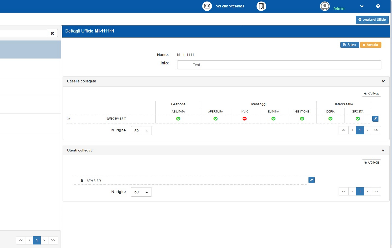 Dopo aver creato l’ufficio, o selezionato uno già esistente, si potrà accedere al dettaglio dell’Ufficio in questione. Da qui sarà possibile modificare le info dell’ufficio e collegare allo stesso sia una o più caselle all’ufficio che collega gli utenti. Nella figura successiva è possibile vedere come appare la schermata in questione in maniera espansa e con la modifica delle informazioni in corso (accessibile facendo click sul tasto “Modifica” che compare nella schermata di dettaglio visibile nella prima figura della sezione "UFFICI di questa guida).