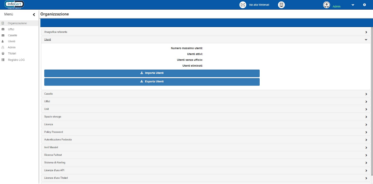 È necessario precisare che l’indicatore “Numero massimo”, presente nelle tre sezioni precedenti, indica il numero massimo di uffici/caselle/utenti che possono essere attivati contemporaneamente. Questo implica che, al raggiungimento ad esempio del numero massimo di caselle, si potrà inserire una nuova casella solo se prima se ne sarà rimossa una di quelle precedentemente inserite. Discorso analogo si applica anche a uffici e utenti.