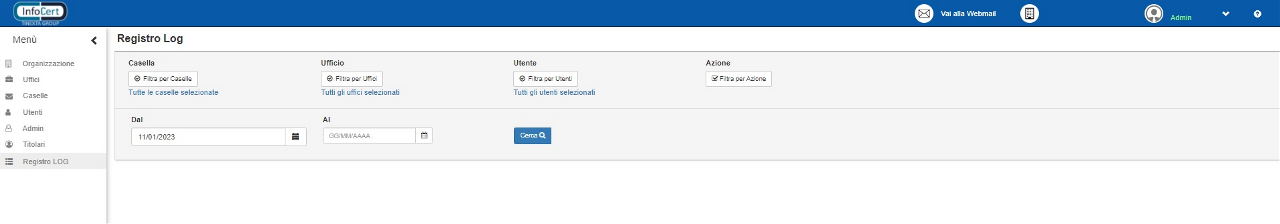 Con la ricerca è possibile impostare filtri per un determinato intervallo temporale, specificare una casella/utente/ufficio, o filtrare per azione.