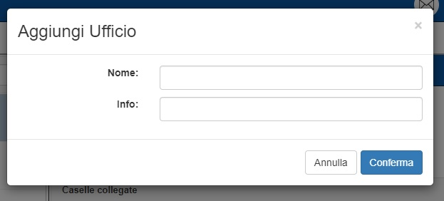 Le uniche informazioni da inserire sono il “Nome” dell’ufficio, che non sarà possibile modificare in seguito, e una breve descrizione nel campo “Info”, modificabile in qualunque momento. L’ufficio risulterà creato non appena si sarà validata la scelta attraverso il tasto “Conferma”.