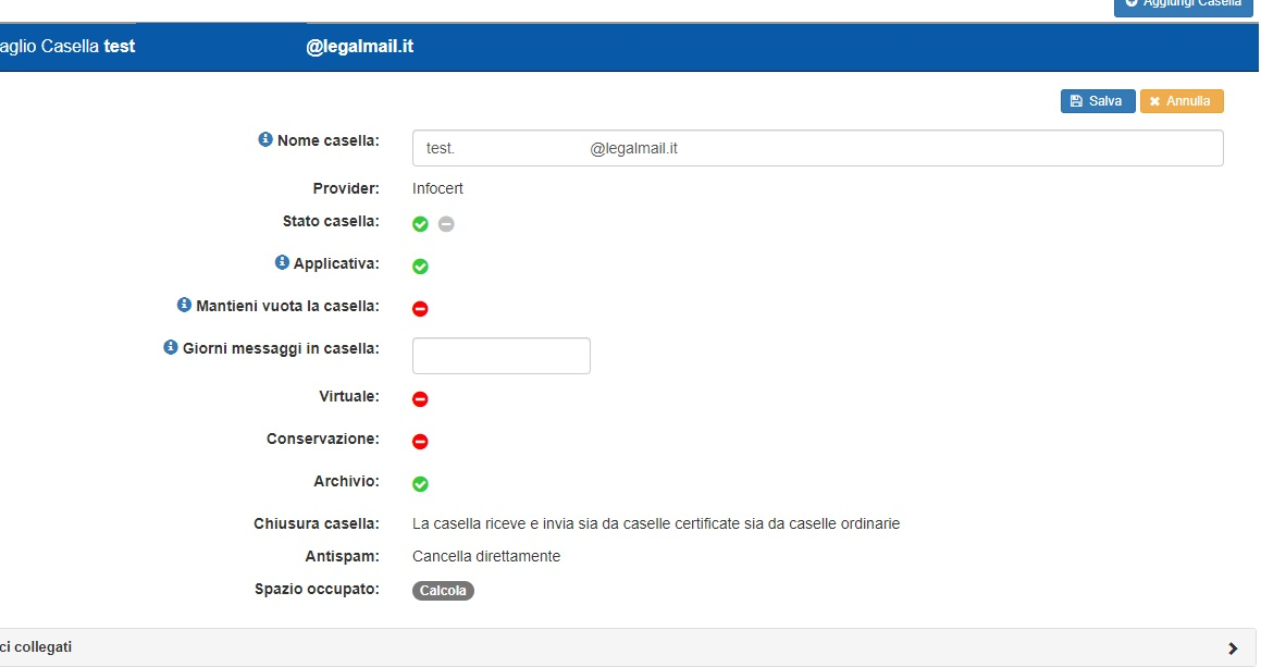 Nel caso si tratti di una casella configurata come applicativa, appariranno anche i “Giorni messaggi in casella”, modificabili in qualunque momento. Nel caso si tratti di una casella virtuale si vedrà solamente il nome della casella.