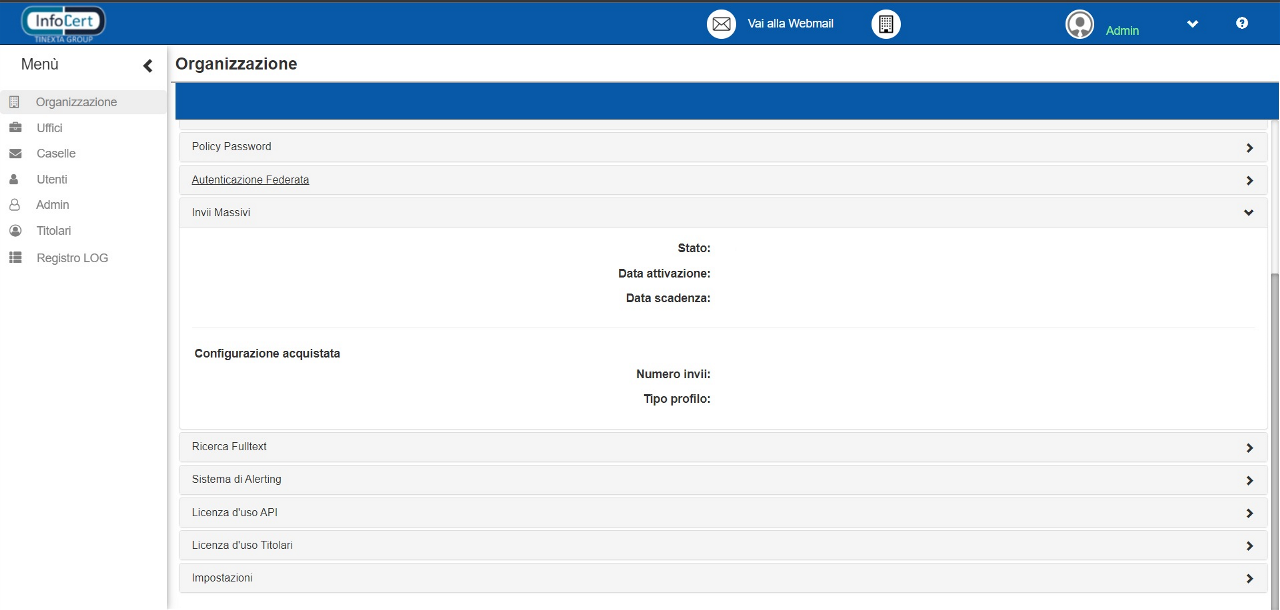 Permette di visualizzare le informazioni relative agli “Invii Massivi”, qualora questi siano stati acquistati.