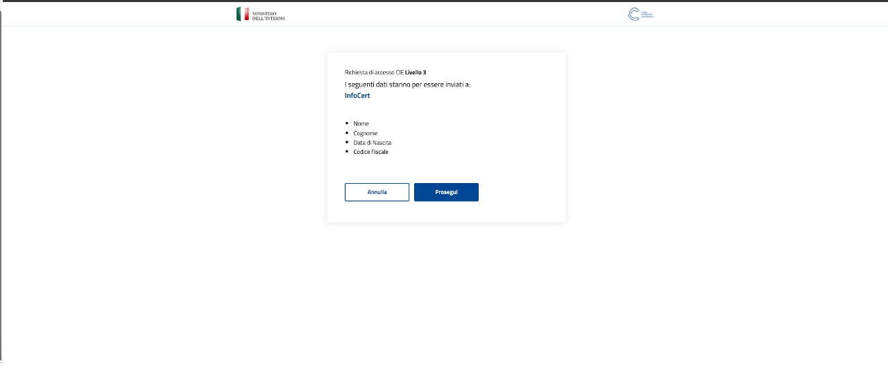 A seguito dell'autenticazione l'Identity Provider CIE, il soggetto dà l'autorizzazione al trasferimento di alcuni attributi.