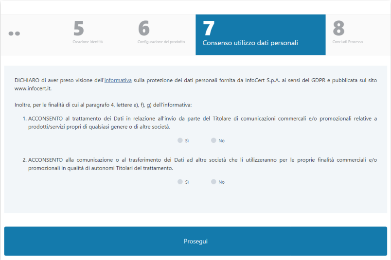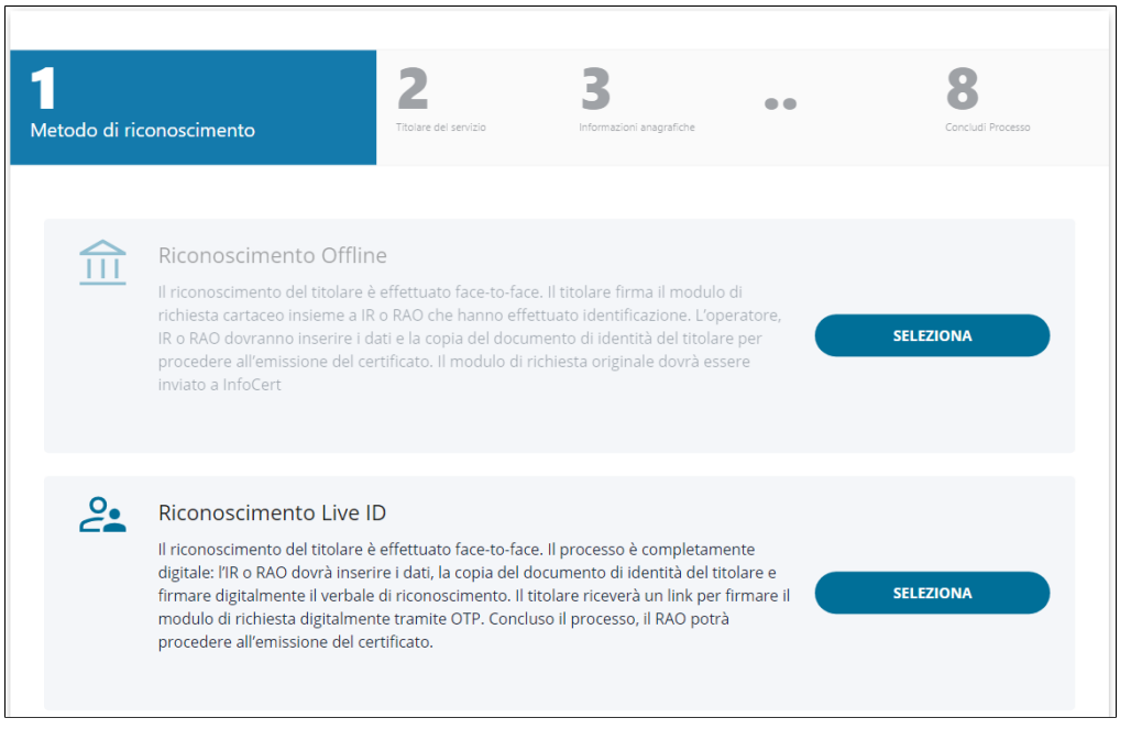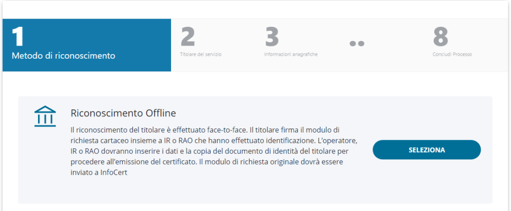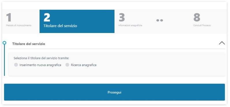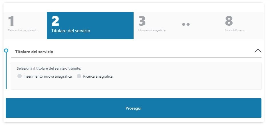 Il processo di richiesta prodotto è diviso in 8 step e si biforca inizialmente in base al tipo di riconoscimento dell'utente finale che viene selezionato tra quelli a disposizione:
