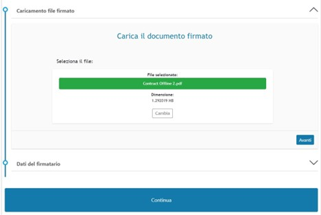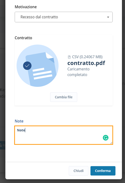 Nel caso in cui sia previsto (recesso dal contratto) è necessario caricare il contratto da cui si recede, inserire eventuali note e cliccare su continua: