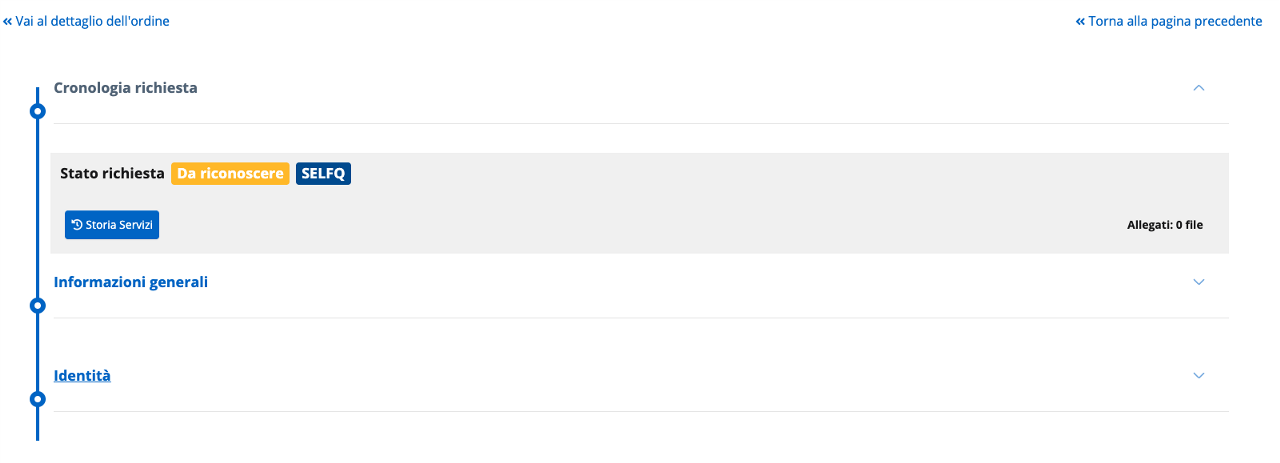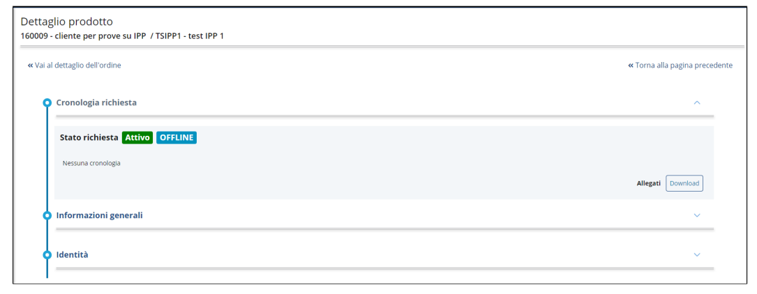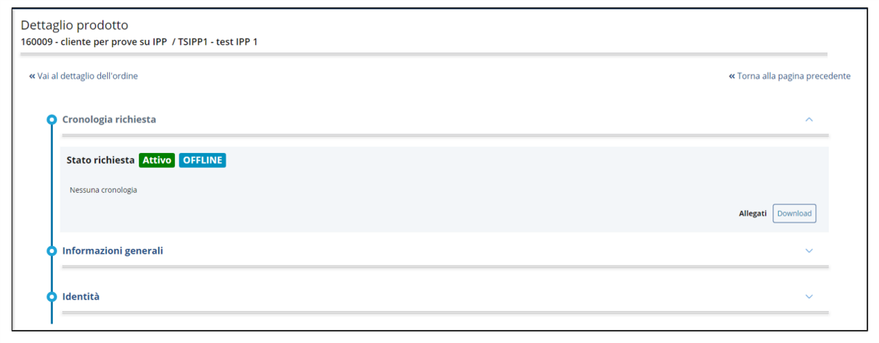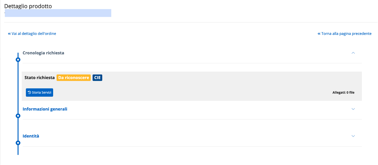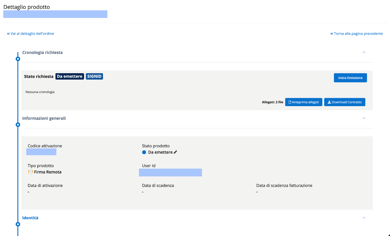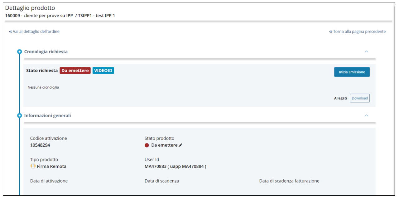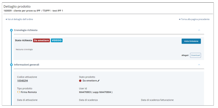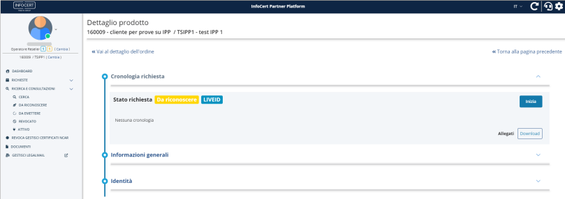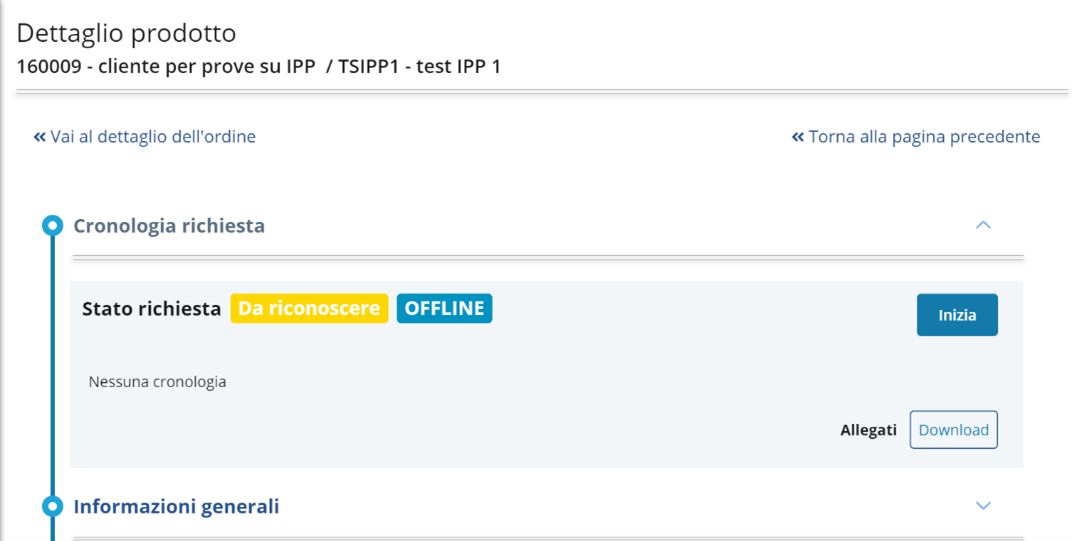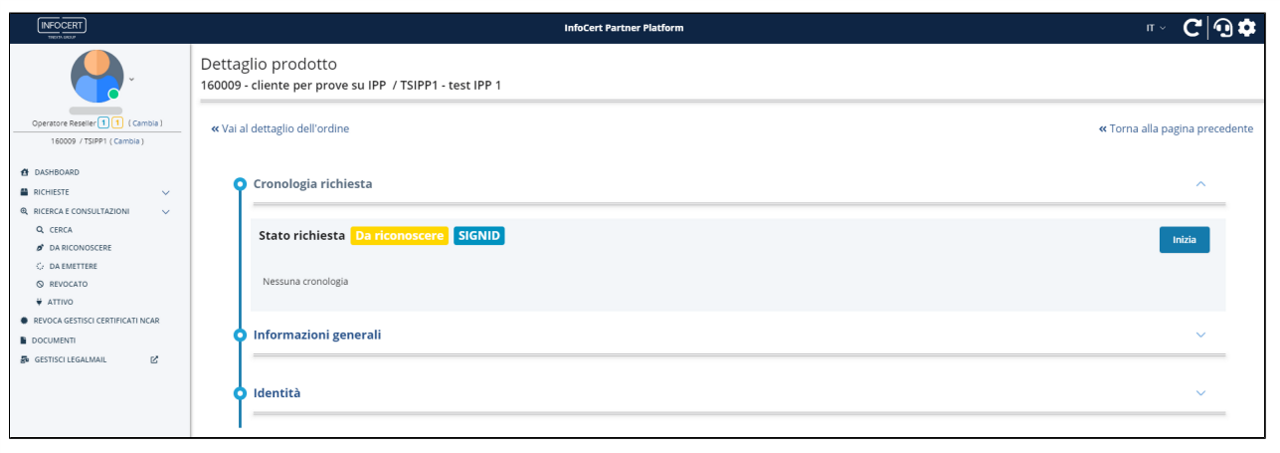 Cliccando sul bottone Vai al prodotto dalla schermata di conferma del completamento della richiesta, l'operatore IR/RAO atterra sulla pagina di dettaglio prodotto nella quale può procedere con il processo di identificazione cliccando Inizia.