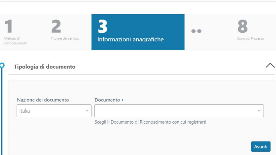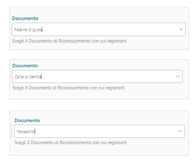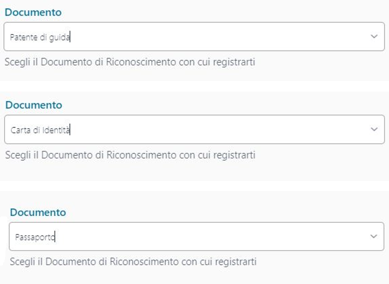 Per prima cosa la nazione del documento e la tipologia scegliendo tra Patente, Carta d'identità e Passaporto per i richiedenti italiani (altrimenti è obbligatorio inserire il passaporto):
