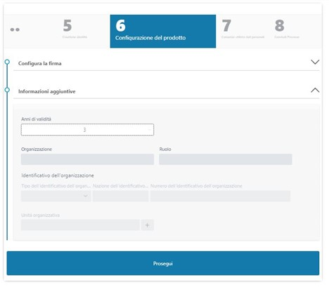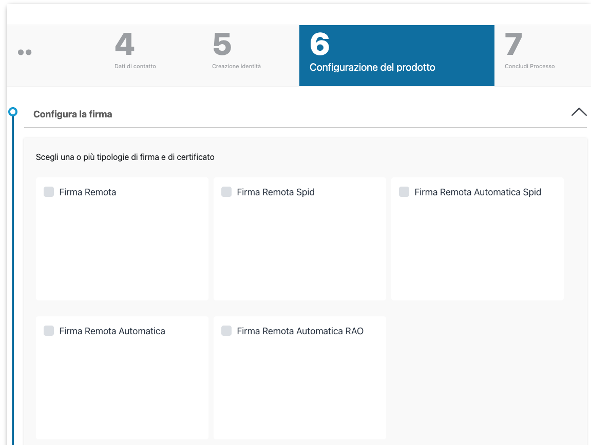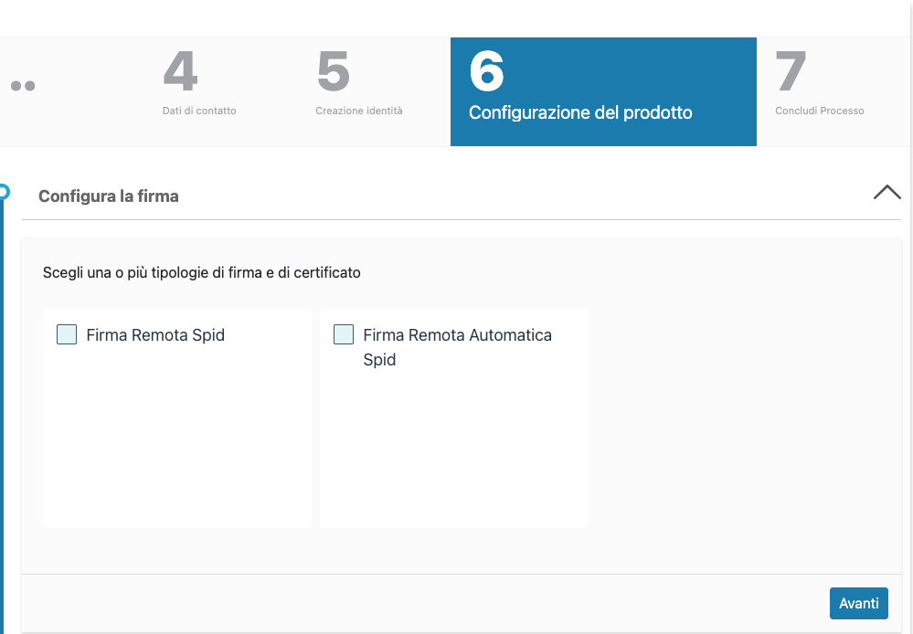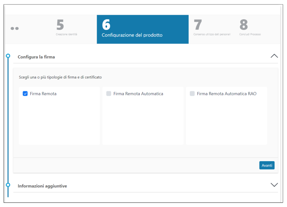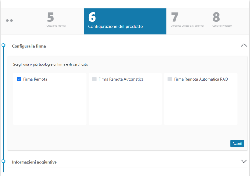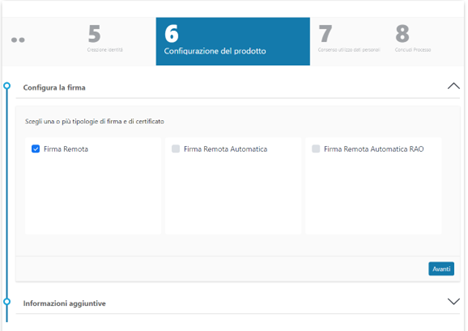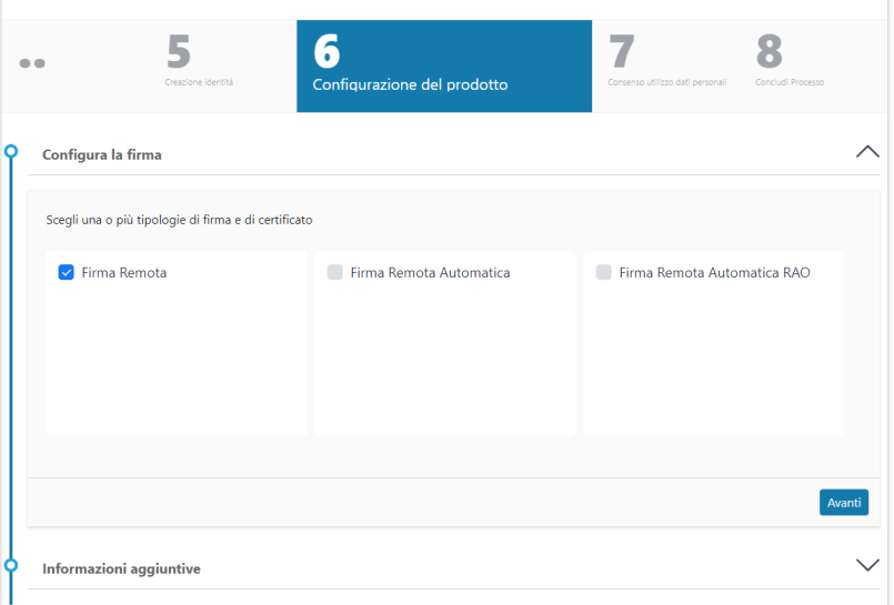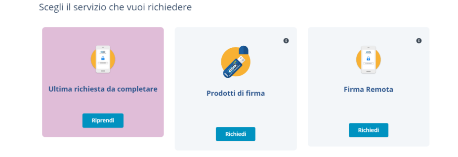Cliccando su Nuova richiesta e poi selezionando Prodotti di firma o Firma remota si inizia il processo di richiesta delle firme: