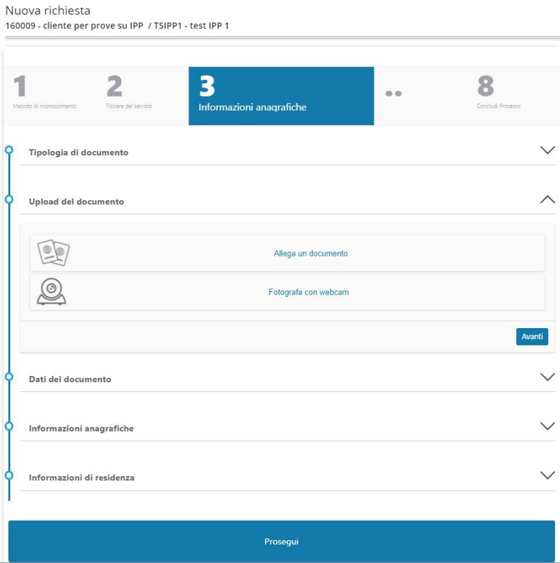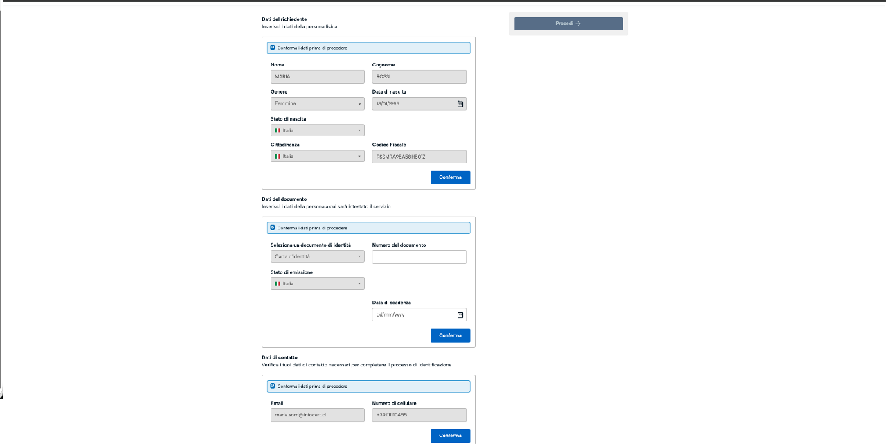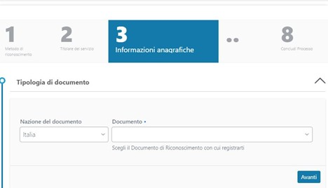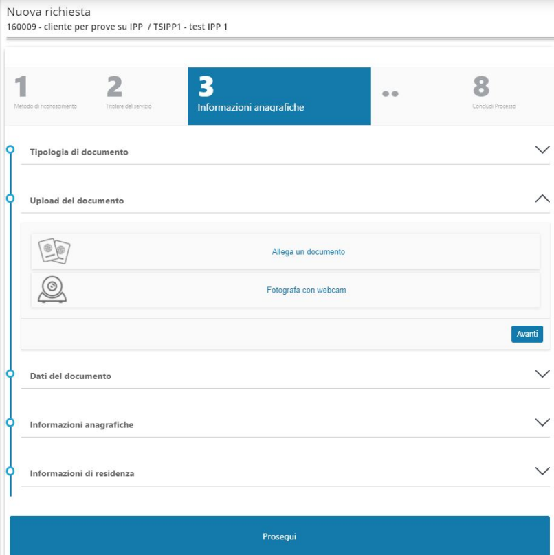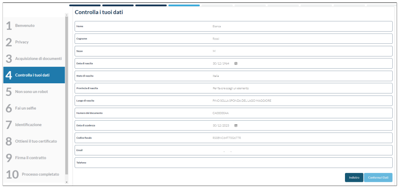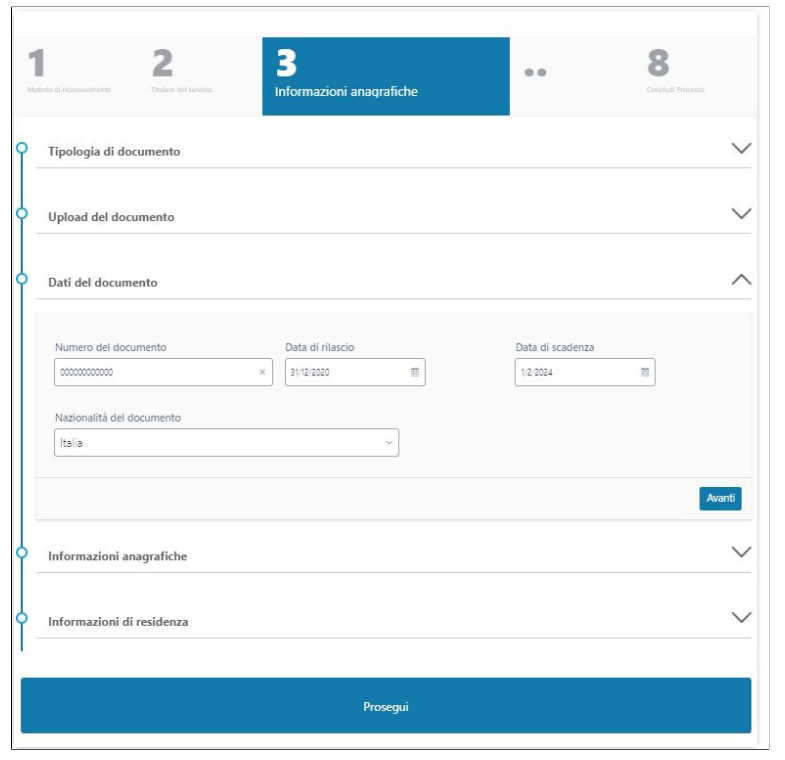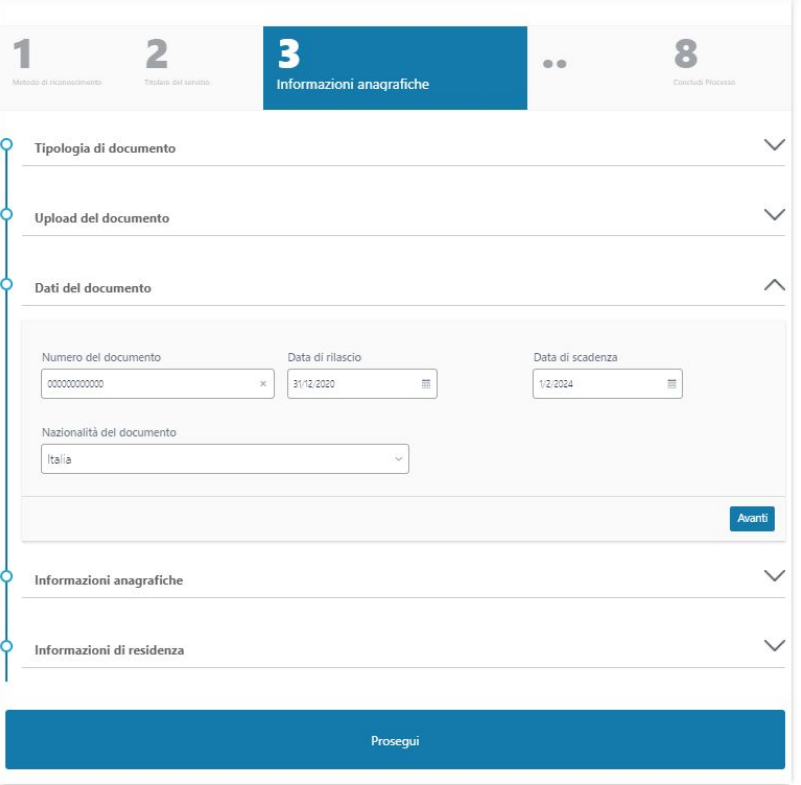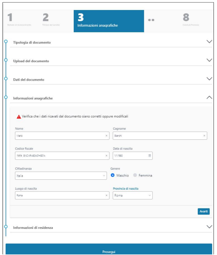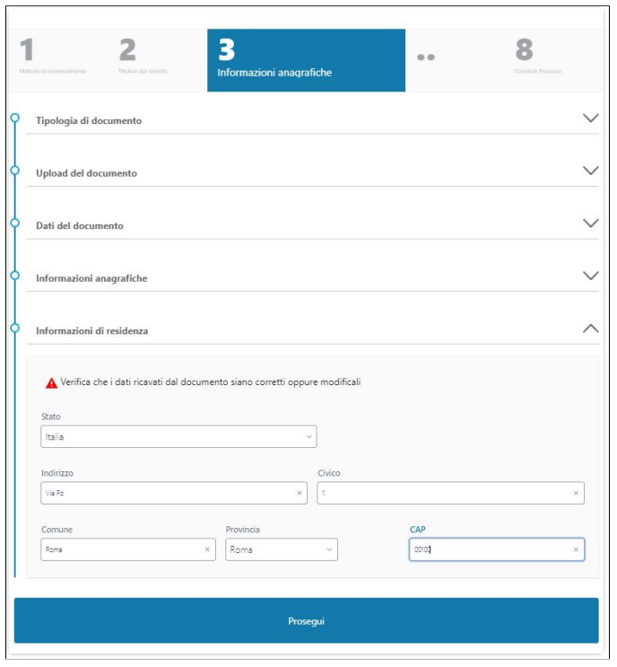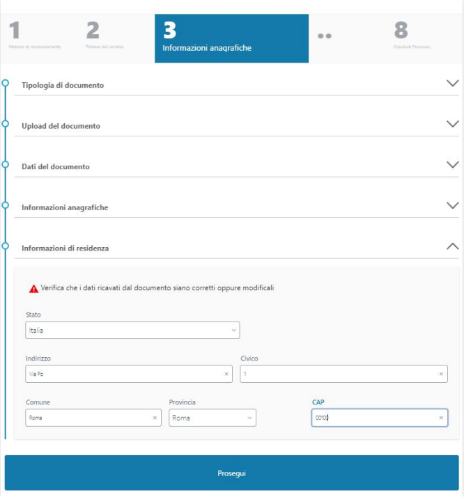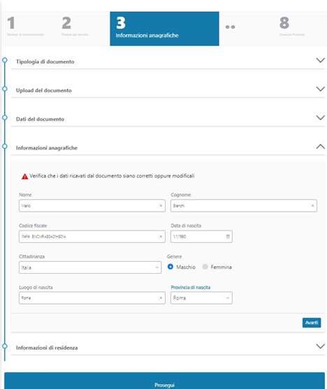 Dopo il controllo delle informazioni relative al documento, all'anagrafica e alla residenza si prosegue cliccando sull' apposito bottone.
