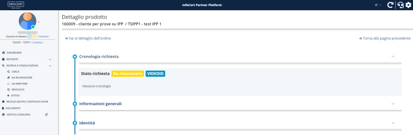 L'operatore cliccando su "Vai al prodotto" troverà lo stato richiesta, che risulta appunto "Da riconoscere" tramite processo di video-riconoscimento: