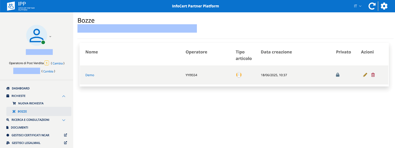 Lo stato della richiesta passerà quindi in Bozza e sarà visibile nell'apposita sezione di sinistra con dettaglio del nome, operatore, tipo di articolo, data della creazione, visibilità.