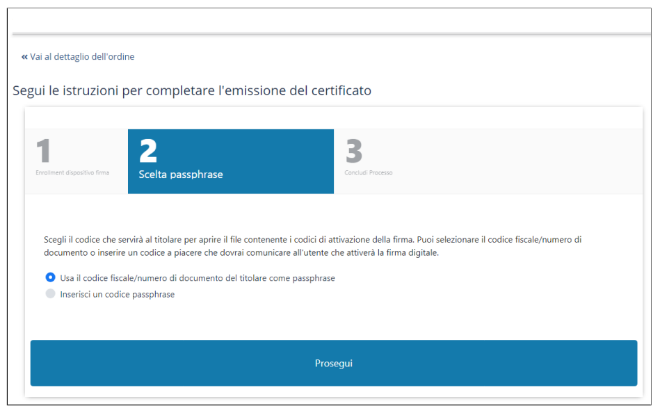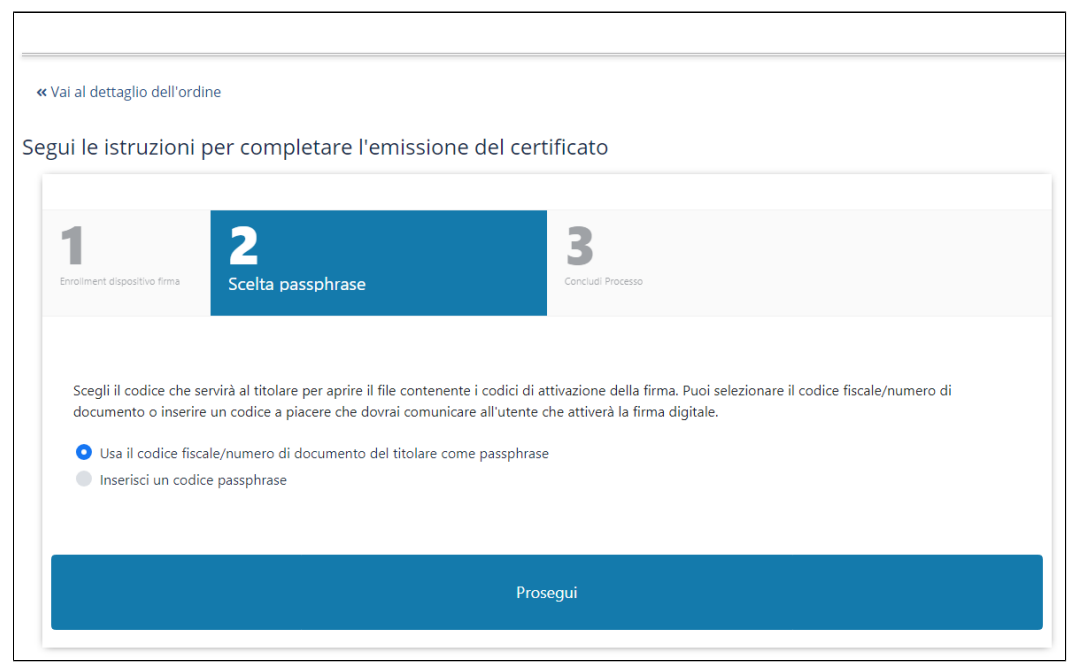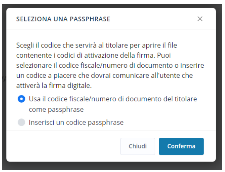 E' possibile selezionare l'opzione Usa il Codice Fiscale del titolare come Passphrase o decidere di indicarne uno differente selezionando la seconda opzione: