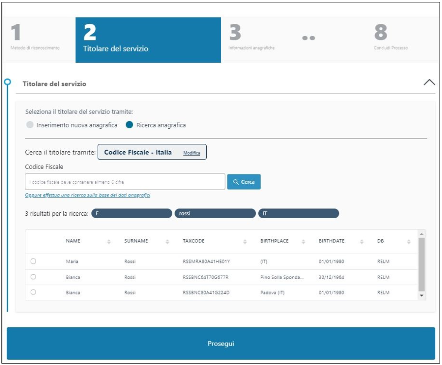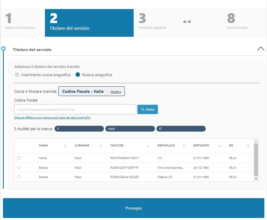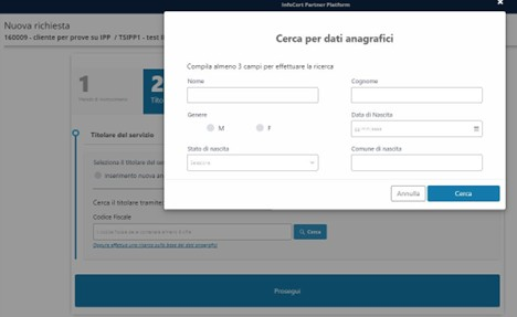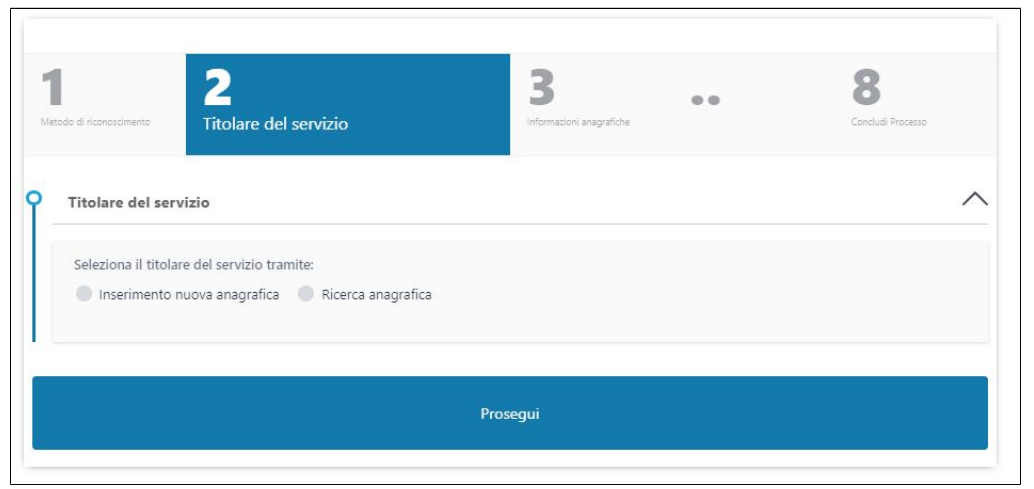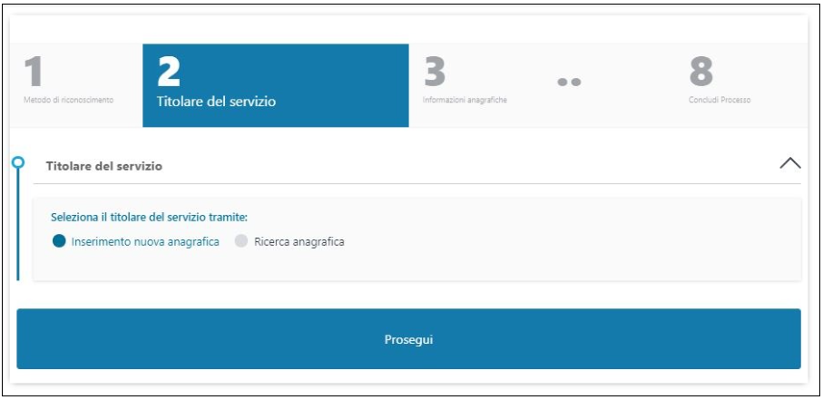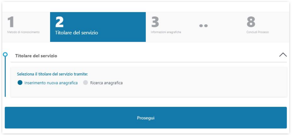 Nel caso l'anagrafica del richiedente non sia già presente nei sistemi è possibile crearla cliccando sull'opzione "Inserimento nuova anagrafica" e poi su Prosegui
