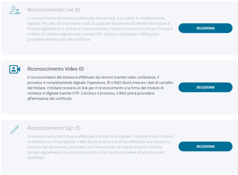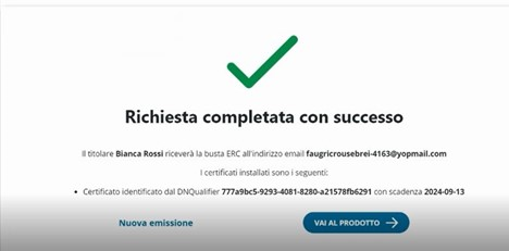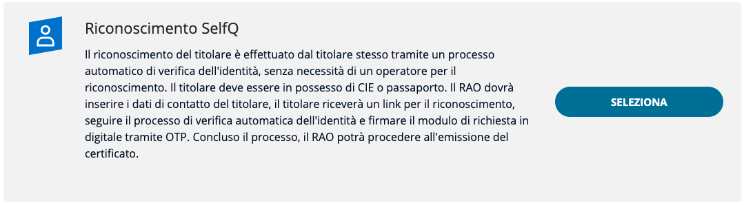Dopo che l'operatore, IR o RAO ha inserito i dati del titolare, questi riceve una e-mail all'indirizzo indicato contenente il link per accedere alla procedura guidata per effettuare il riconoscimento selfQ; successivamente il titolare procede alla firma del modulo di richiesta tramite codice OTP. Una volta concluso il processo correttamente, il RAO può emettere il certificato anche in un secondo momento.
