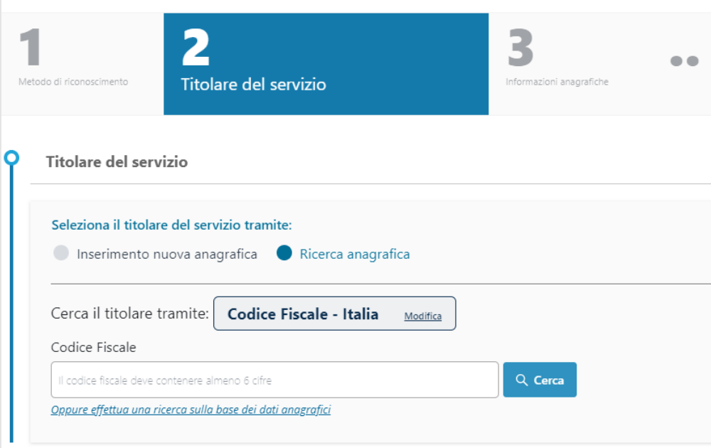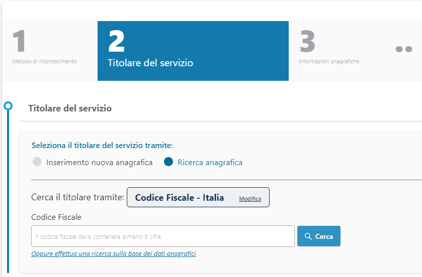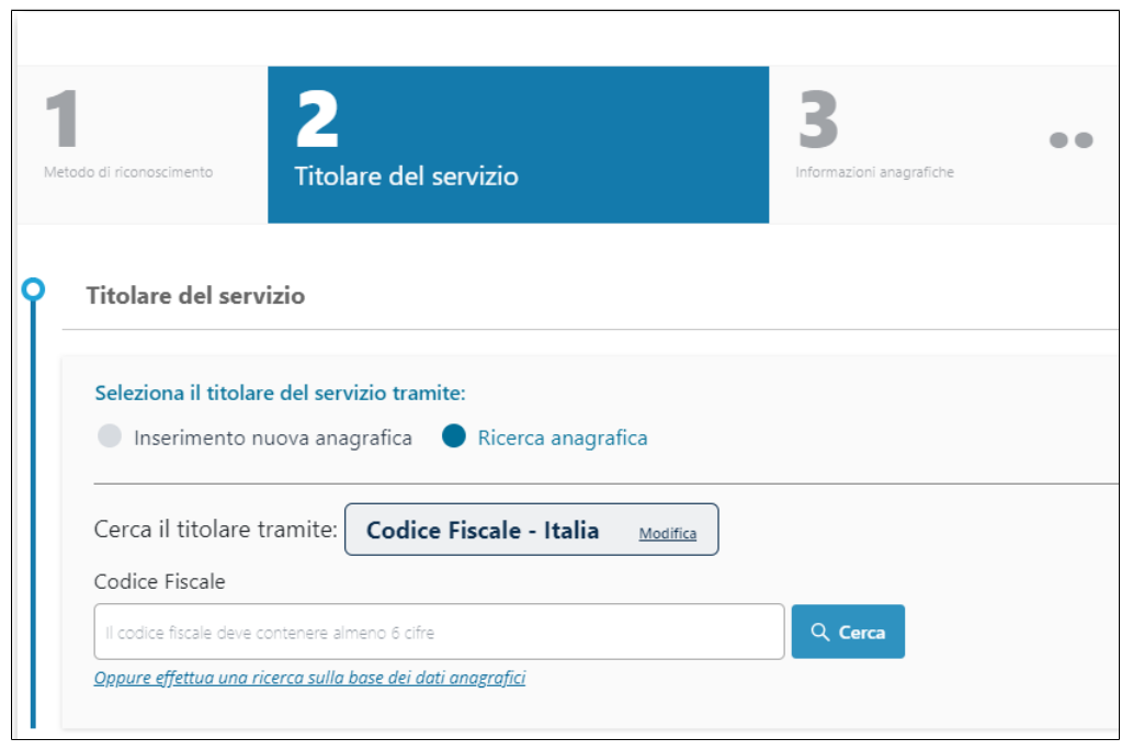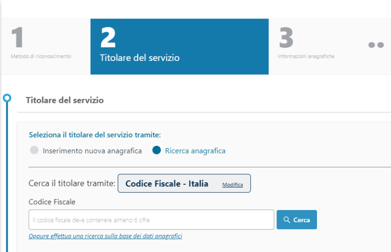 Se al contrario l'anagrafica del richiedente sia già esistente nei sistemi è possibile ricercarla cliccando sull'opzione "Ricerca anagrafica":