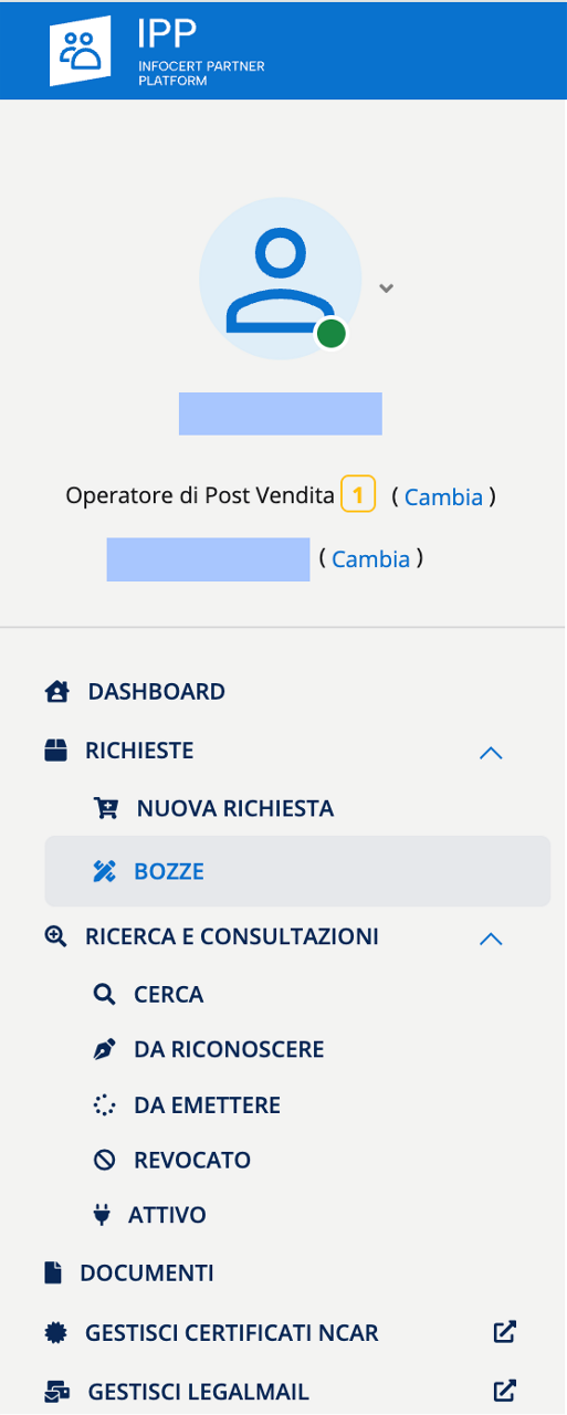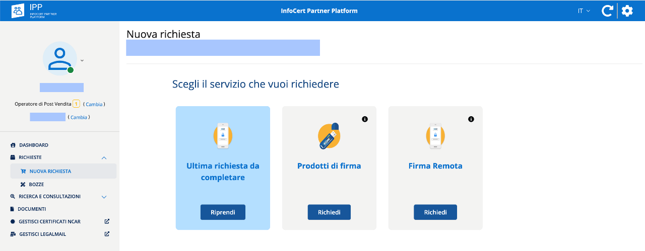 L'Operatore/RAO/IR, una volta effettuato il login su IPP, avvia una nuova richiesta nell'apposita sezione "Richieste" > "Nuova richiesta" scegliendo il prodotto richiesto.