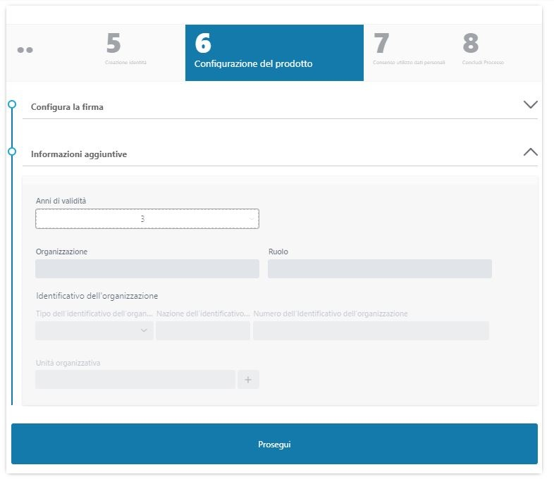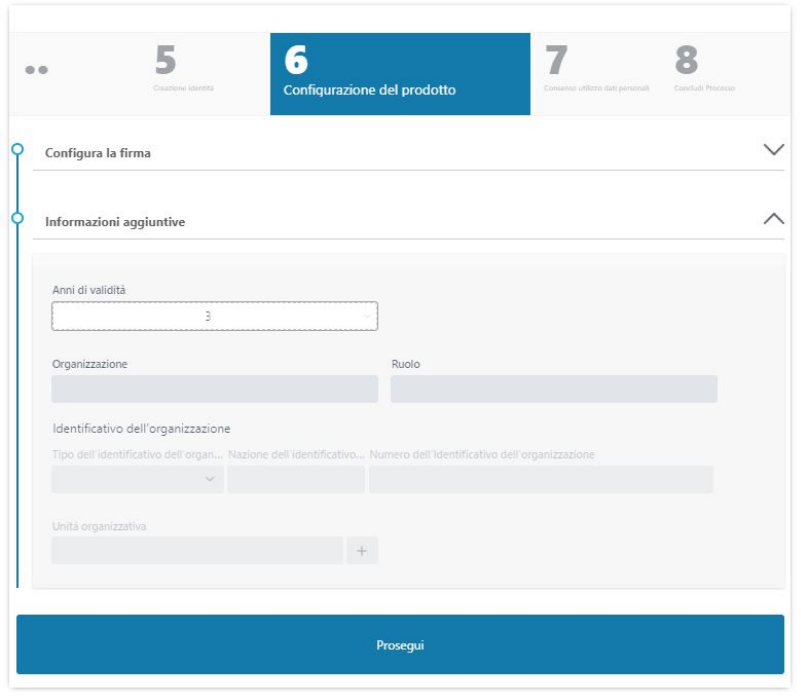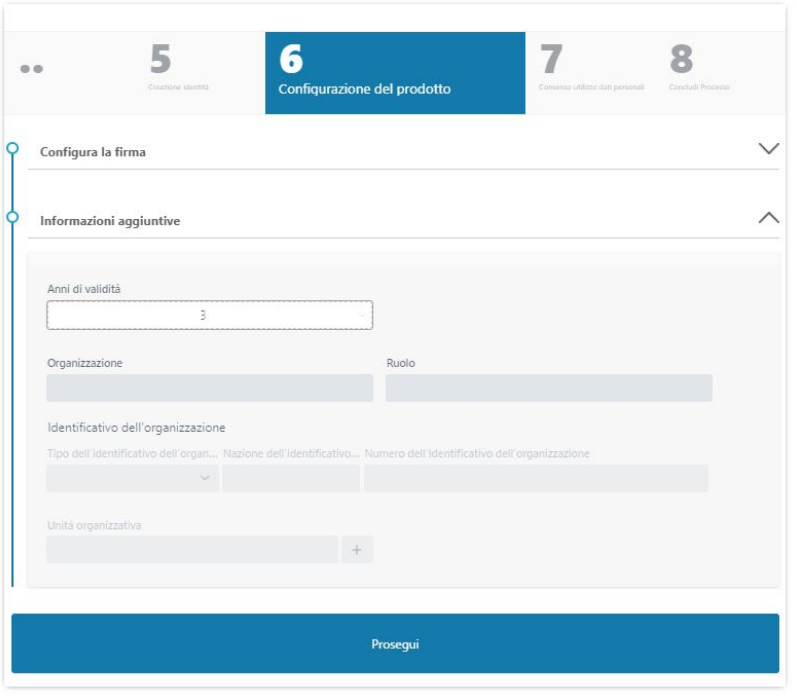 Nel caso di un certificato di ruolo è possibile configurare l'organizzazione di appartenenza ed il ruolo del richiedente: