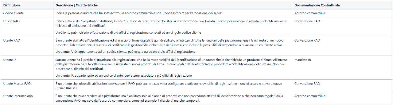 L'utilizzo di InfoCert Partner Platform (IPP) è abilitato per tutti gli utenti appartenenti ad una determinata organizzazione, codificata tramite un codice cliente, e possono avere diverse abilitazioni e autorizzazioni. Nella tabella seguente sono elencati i profili.