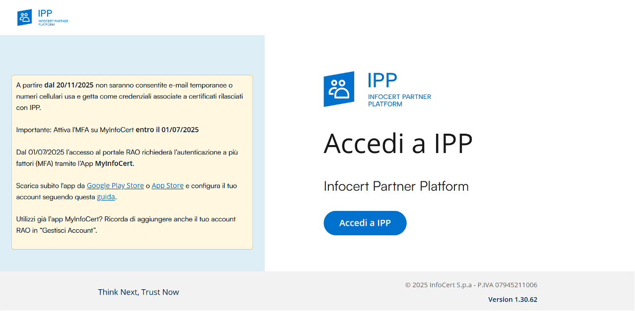 A partire dal 1 luglio 2025 IPP richiede il doppio fattore di autenticazione per accedere (MFA). L'operatore deve scaricare e configurare l'applicazione My Infocert ed utilizzarla per accedere tramite QRCode o con le credenziali ed un successivo fattore di autenticazione: notifica push, QRCode oppure OTP generato dall'app.