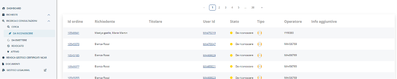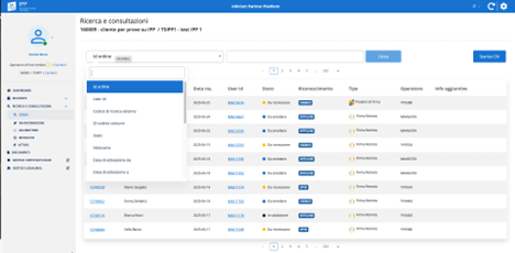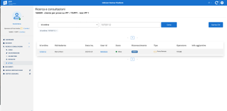 I valori restituiti sono ID ordine (cliccabile), Richiedente, Data inserimento, UserID (cliccabile), stato, tipo di riconoscimento, tipo di prodotto, operatore ed info aggiuntive: