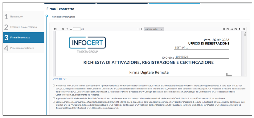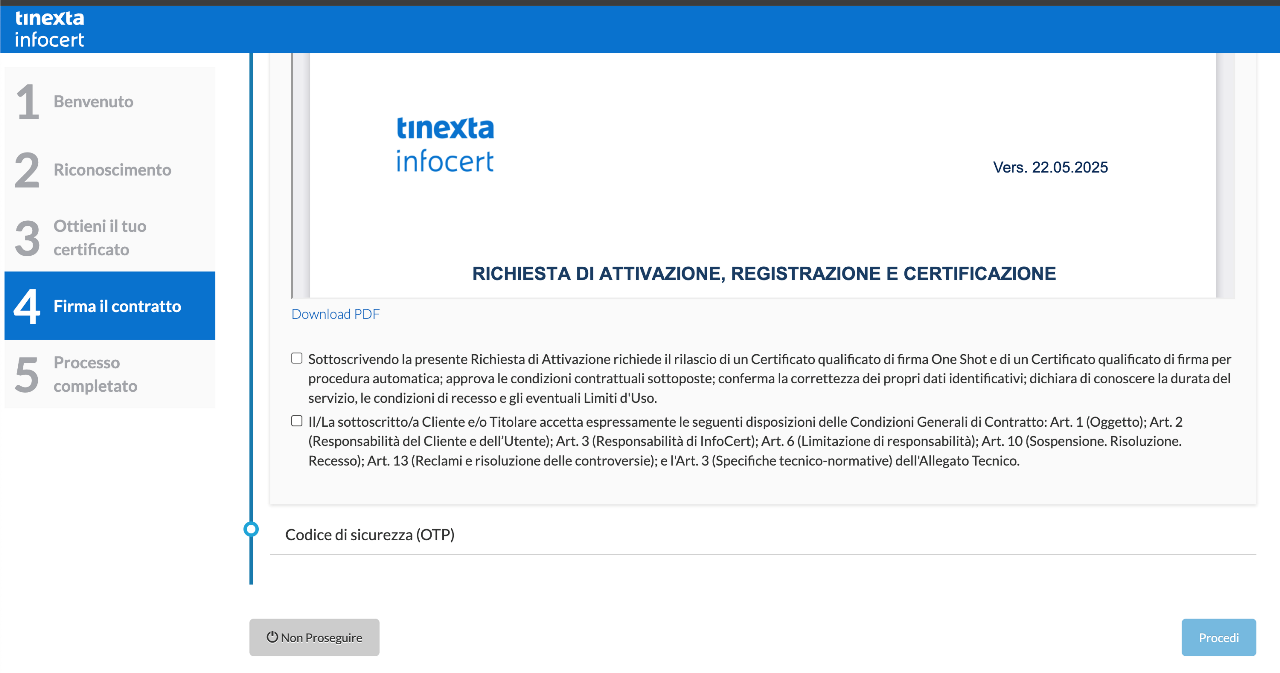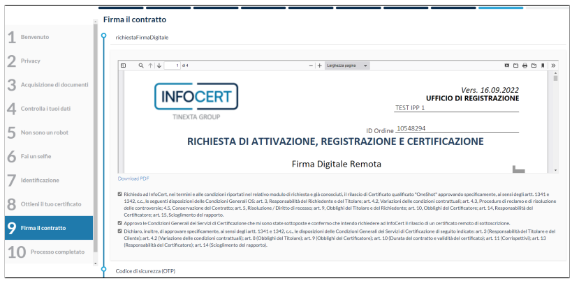 Selezionando le condizioni indicate, il soggetto può proseguire e firmare il contratto inserendo l'OTP ricevuto.
