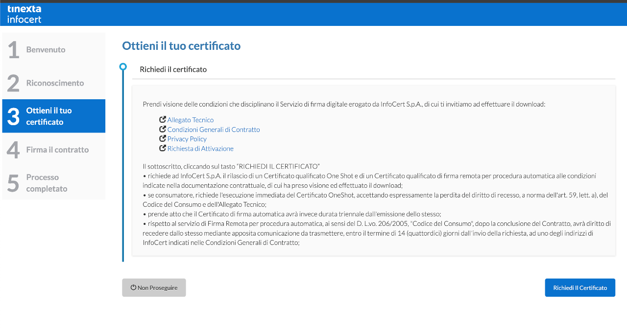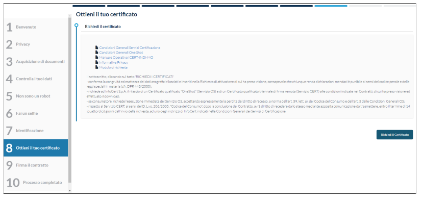 Il soggetto per proseguire preme il pulsante Richiedi il Certificato.