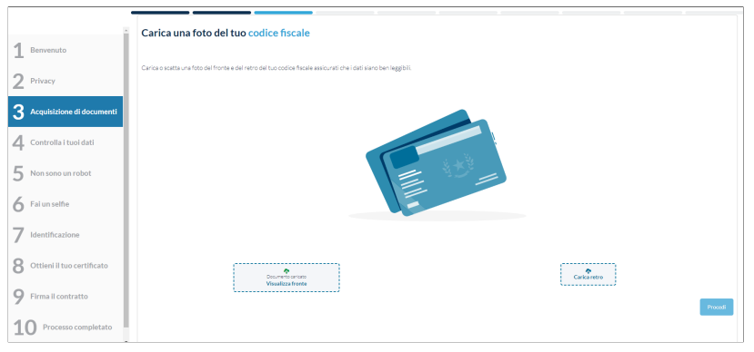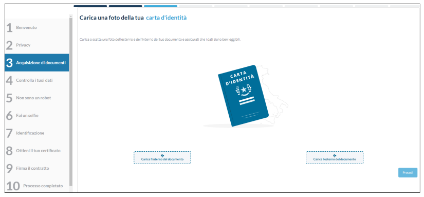 Il successivo passaggio prevede l'inserimento del documento nel sistema, effettuando il caricamento delle immagini o scansioni del documento oppure fotografando i documenti originali con la webcam del computer: