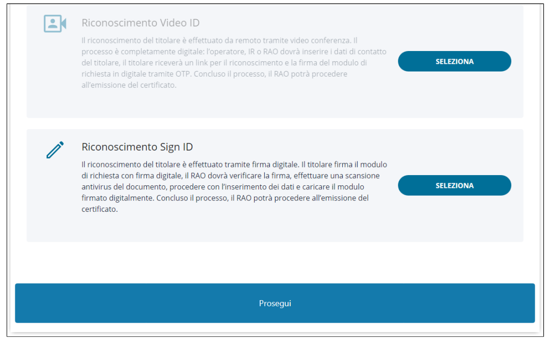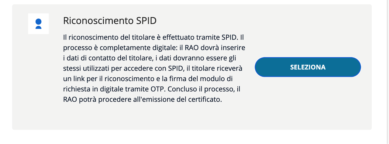 Dopo che l'operatore, IR o RAO ha inserito i dati del titolare, questi riceve una e-mail all'indirizzo indicato contenente il link per accedere alla procedura guidata per effettuare il riconoscimento SPID; successivamente il titolare procede alla firma del modulo di richiesta tramite codice OTP. Una volta concluso il processo correttamente, il RAO può emettere il certificato anche in un secondo momento.
