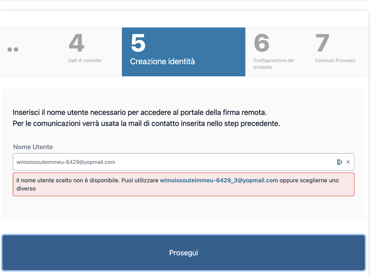 Nel caso quella e-mail sia già utilizzata da un'altra identità Tinexta InfoCert, verrà proposto di utilizzare un altro alias basato sulla e-mail iniziale.