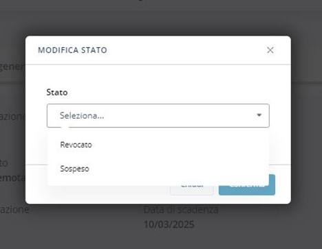 L'operatore RAO clicca quindi sull'icona della penna accanto allo stato Attivo del prodotto e seleziona il nuovo stato Revocato nelle opzioni del menù a tendina:
