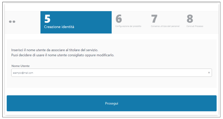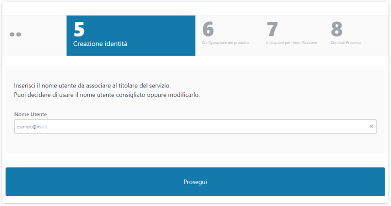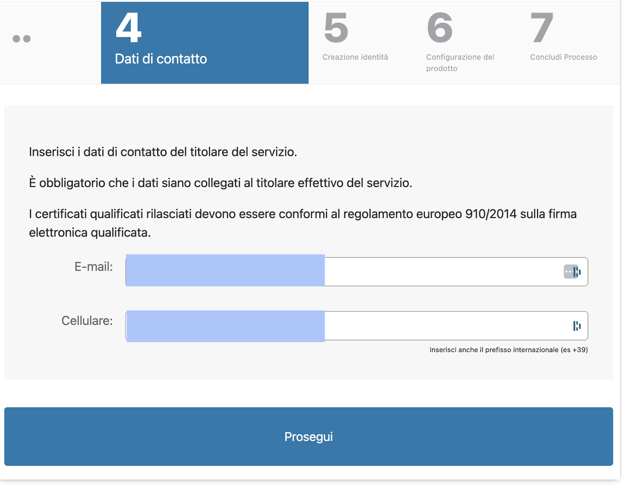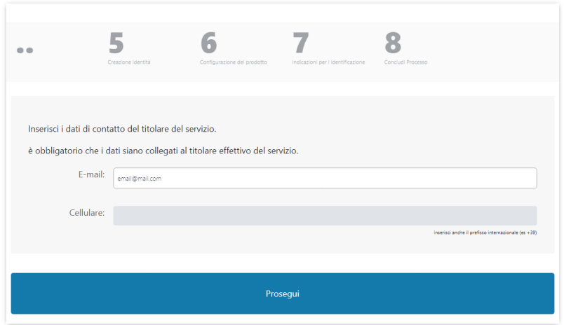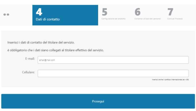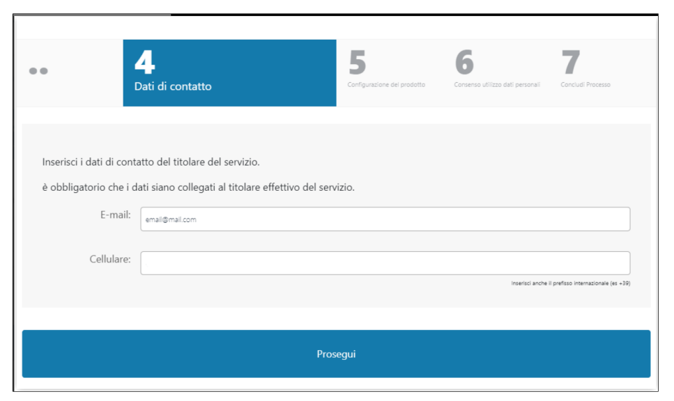 Successivamente è necessario inserire e-mail e cellulare, non precedentemente utilizzati, collegati all'effettivo titolare del servizio: