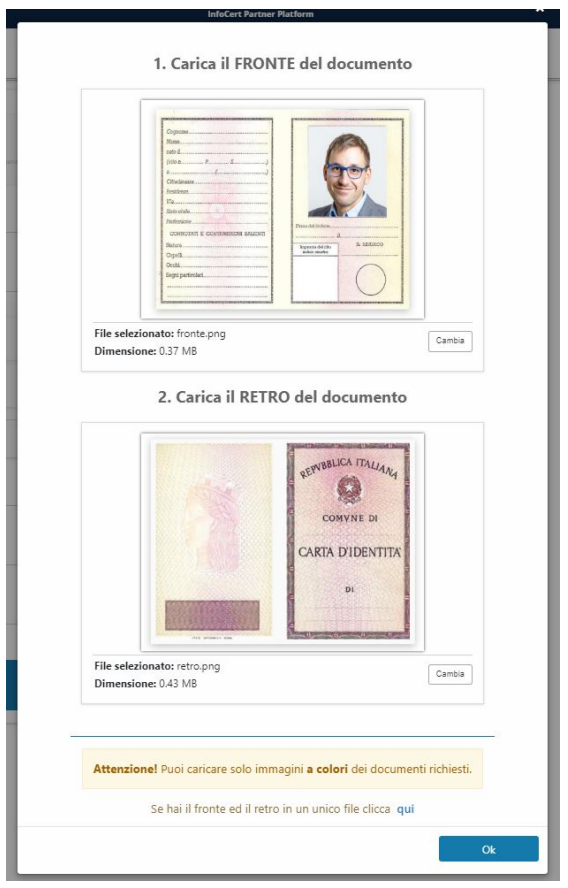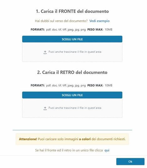 Cliccando sull'opzione Allega il documento apparirà una finestra per fare l'upload delle immagini a colori del documento (sono ammesse due foto differenti per fronte/retro o un' unica immagine che contenga entrambi gli elementi):