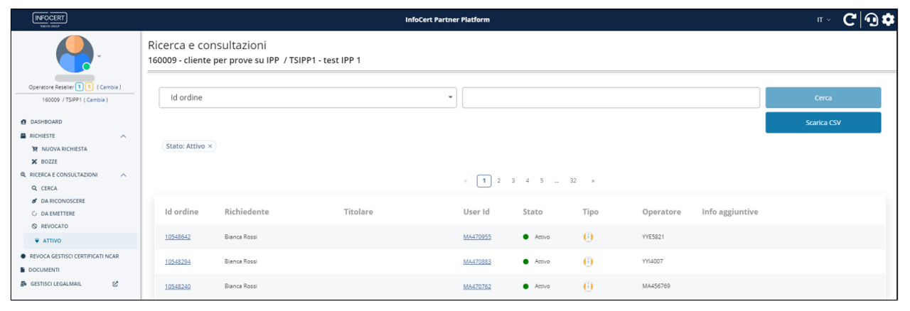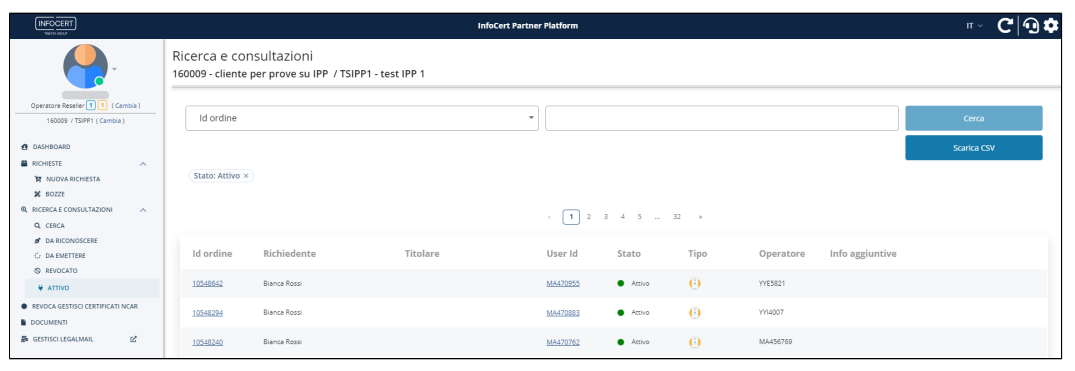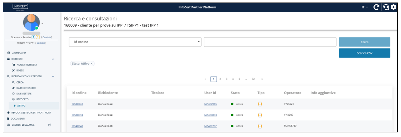 Qualora fosse necessario inviare nuovamente al richiedente la mail contenente la busta cifrata con i codici di attivazione della firma digitale, l'operatore RAO può ricercare l'ordine in questione dal menù laterale Ricerca e consultazioni > Attivo tramite i filtri disponibili: