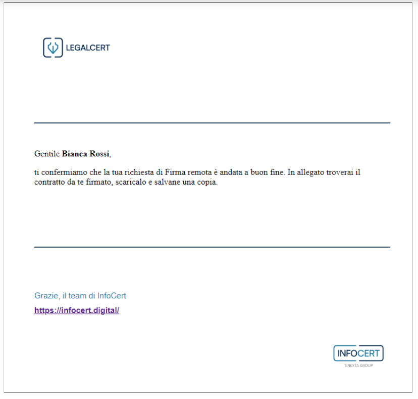 A riprova del completamento del processo, il richiedente riceve una mail di conferma dell'avvenuta firma del contratto (nell'esempio di un firma remota).