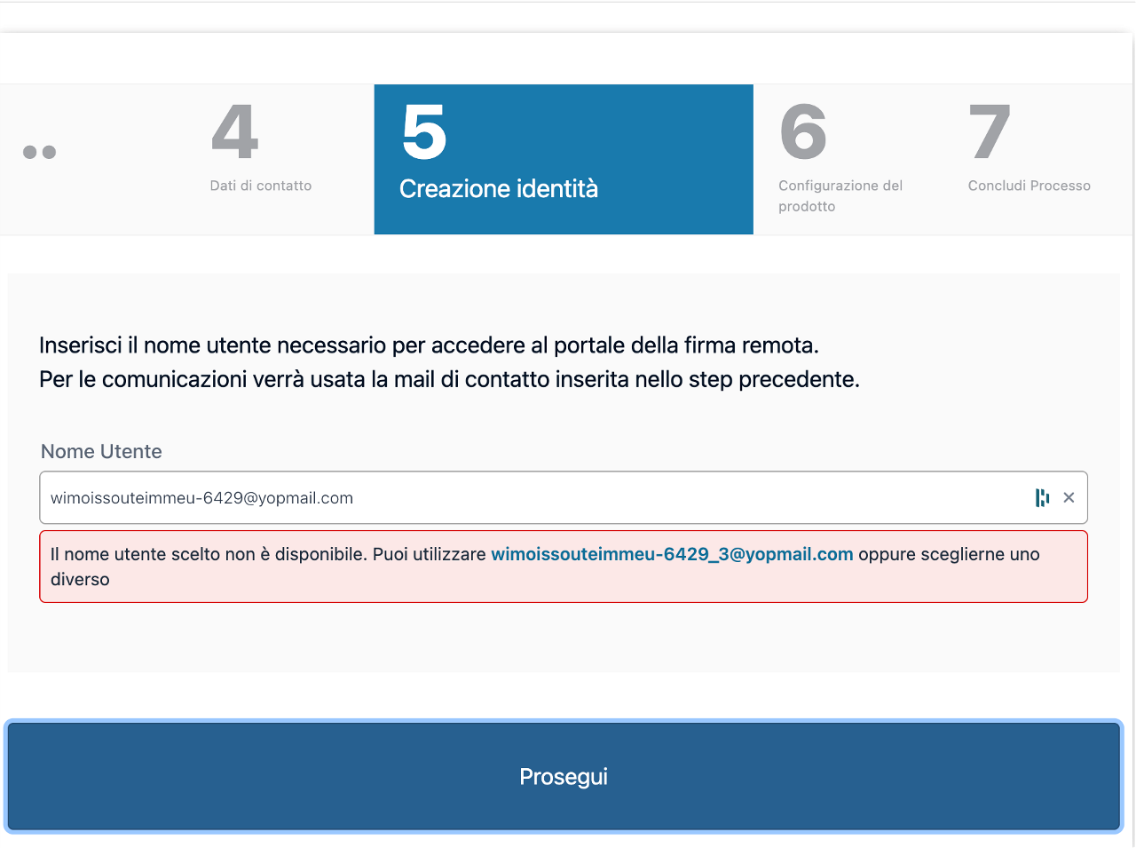 Nel caso quella e-mail sia già utilizzata da un'altra identità Tinexta Infocert, verrà proposto di utilizzare un altro alias basato sulla e-mail iniziale.