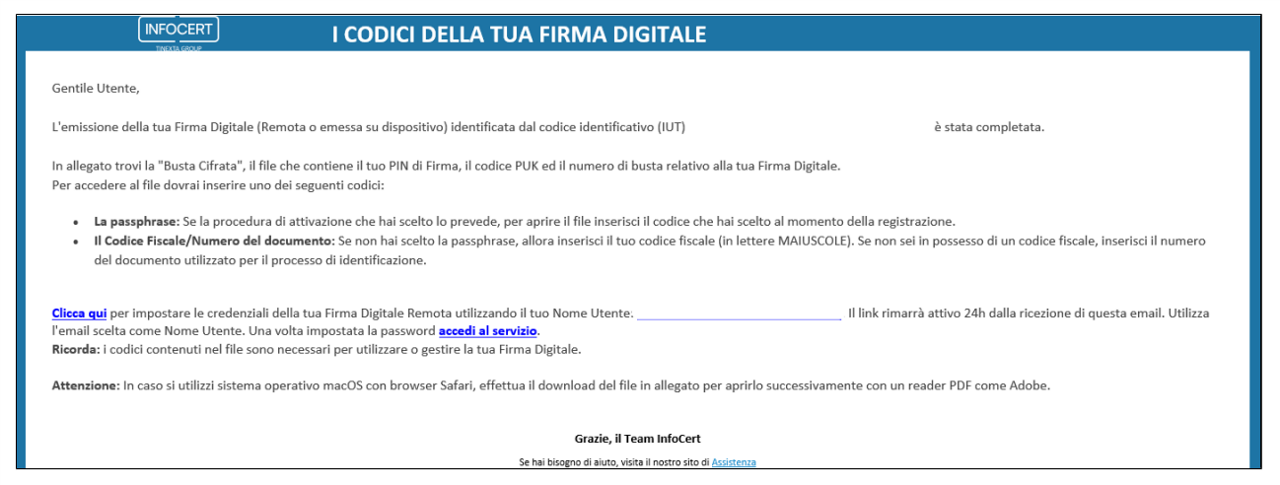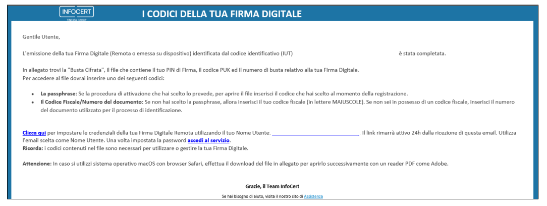 Il cliente riceve contestualmente la seguente mail con allegato il file contenente i codici cifrati di attivazione della firma: