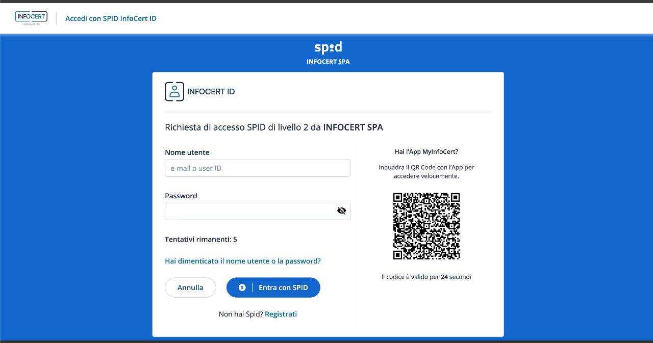 Il soggetto si autentica con SPID premendo il pulsante "Entra con SPID" selezionando il proprio Identity Provider. Nell'esempio verrà scelto come Identity Provider Tinexta InfoCert.