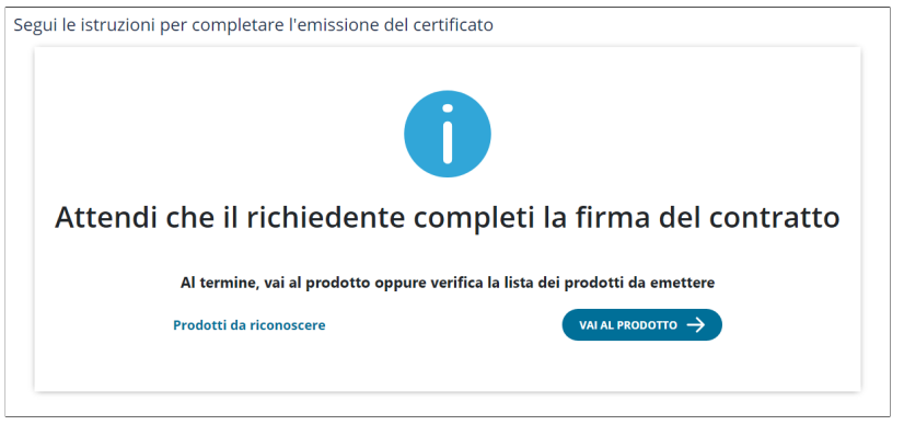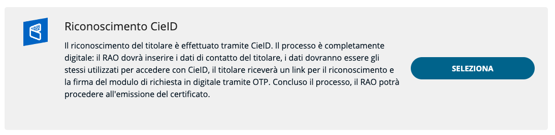 Dopo che l'operatore, IR o RAO ha inserito i dati del titolare, questi riceve una e-mail all'indirizzo indicato contenente il link per accedere alla procedura guidata per effettuare il riconoscimento CIE; successivamente il titolare procede alla firma del modulo di richiesta tramite codice OTP. Una volta concluso il processo correttamente, il RAO può emettere il certificato anche in un secondo momento.