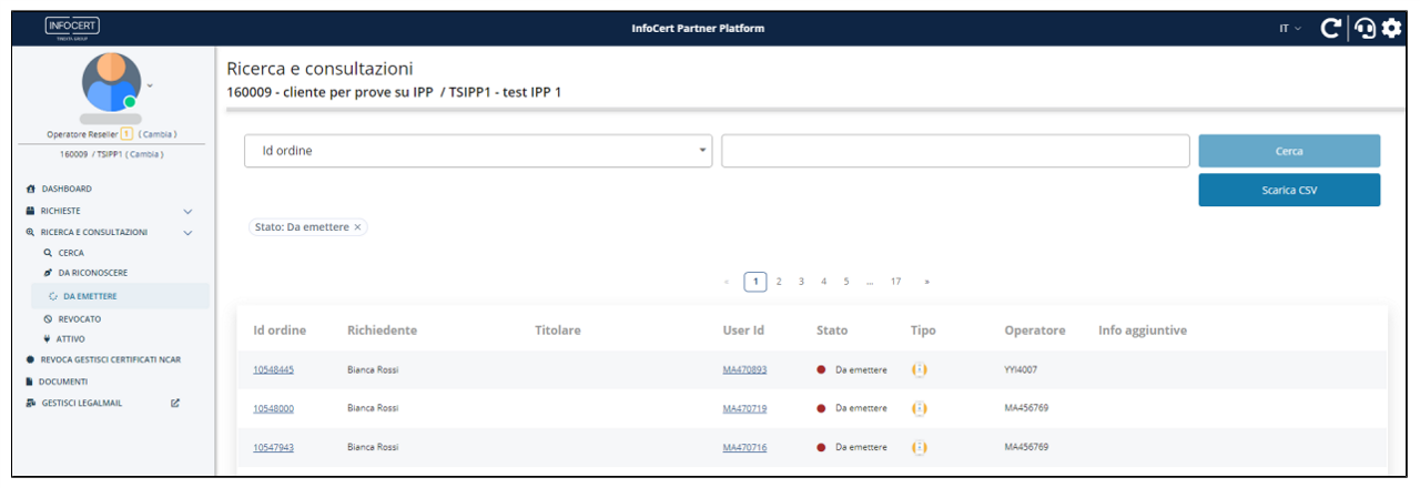 Il RAO può direttamente continuare il processo di emissione a valle del riconoscimento, oppure riprenderlo in un secondo momento nel menù laterale in Ricerca e consultazioni alla sezione Da emettere, nella quale l'operatore può trovare tutte le richieste effettuate che devono essere ancora emesse: