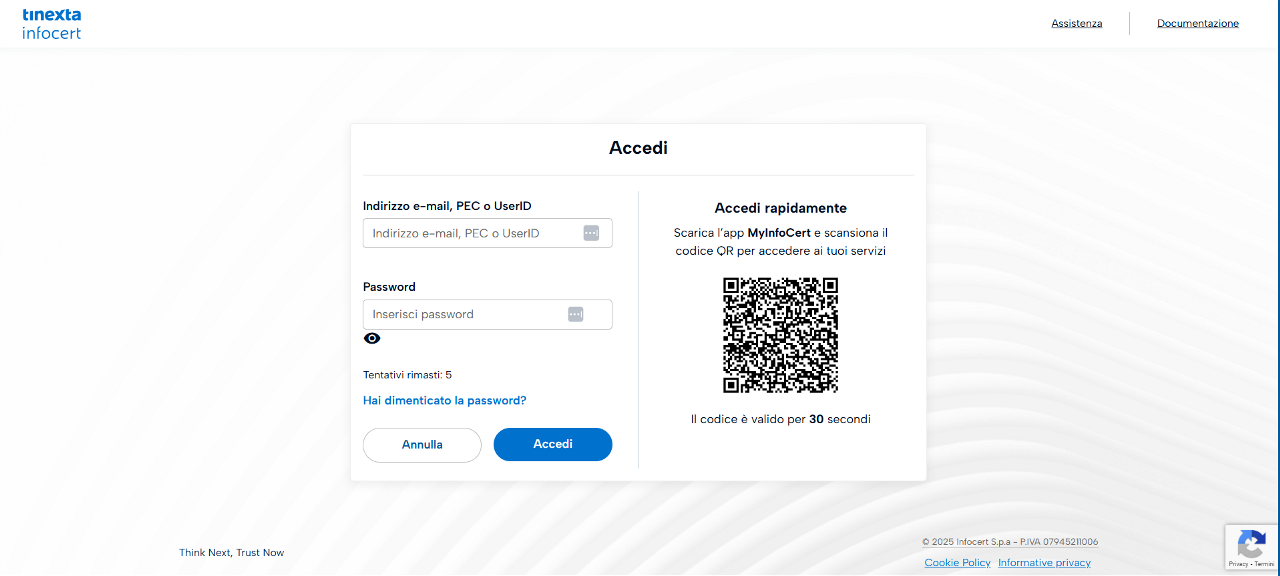 Dopo aver premuto il pulsante Accedi a IPP viene presentato il sistema di autenticazione comune a tutti i servizi Tinexta Infocert: