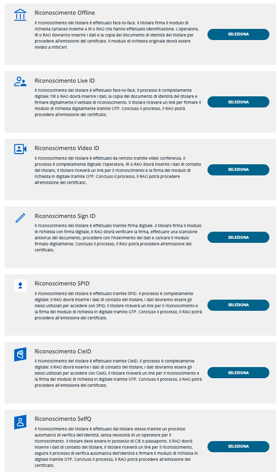 Nello step successivo è possibile selezionare il tipo di certificato che si intende rilasciare in base a quelli disponibili: