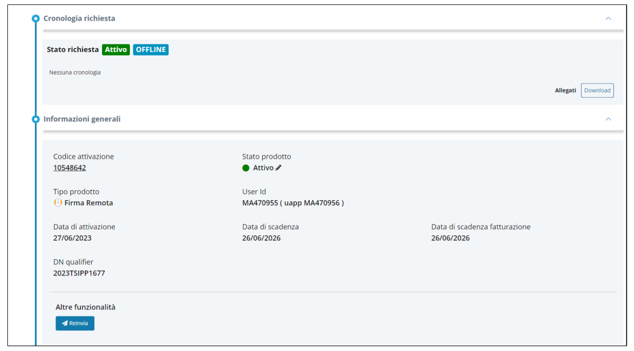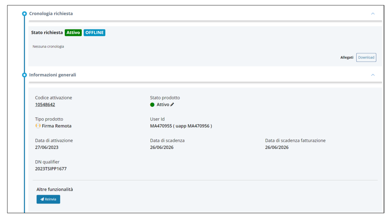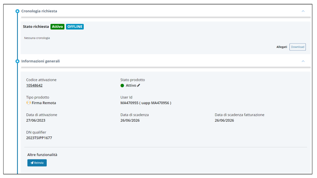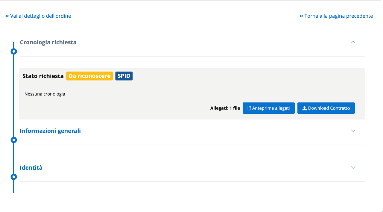 La cronologia richiesta contiene anche le evidenze raccolte dall'operatore e da qui è possibile scaricare il contratto e re-inviarlo nel caso in cui il soggetto non l'abbia ricevuto per e-mail a causa di eventuali filtri antispam.