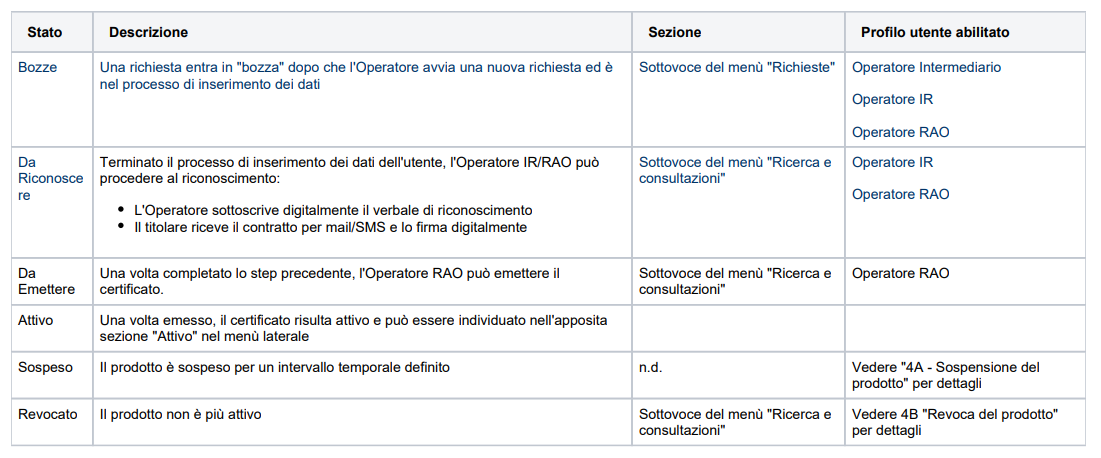 Gli status in cui possono trovarsi i prodotti sono definiti nella tabella seguente e sono degli stati consecutivi: fino a che uno step non è stato completato non è possibile passare allo stato successivo.
