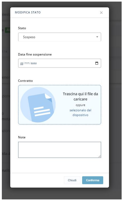 Definisce inoltre la data di fine sospensione, allega il contratto e riporta in Note le motivazioni della sospensione.