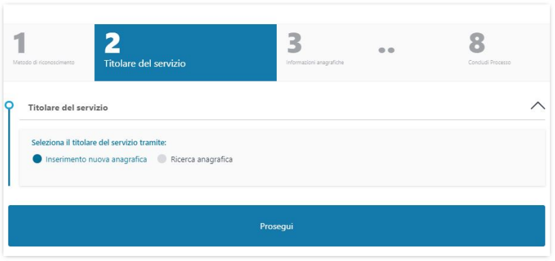 Nel caso l'anagrafica del richiedente non sia già presente nei sistemi è possibile crearla cliccando sull'opzione "Inserimento nuova anagrafica" e poi su "Prosegui":
