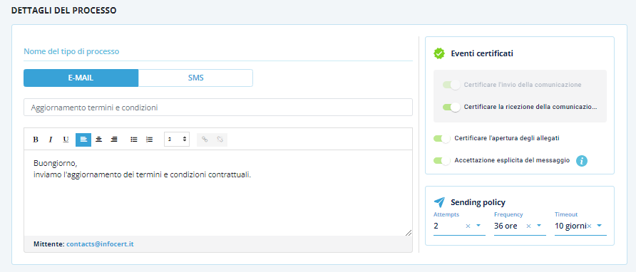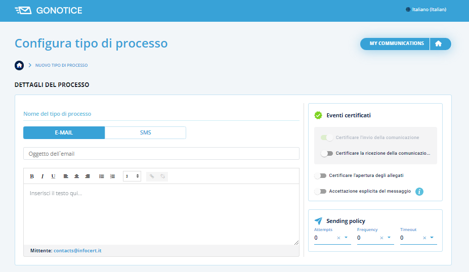 Per creare un nuovo Processo è necessario cliccare su Nuovo tipo di Processo in modo da poter configurare il processo della comunicazione: si potrà scegliere il canale di utilizzo per la comunicazione, e-mail o sms.