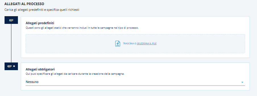 Infine, nella sezione Allegati al Processo, sarà possibile caricare allegati predefiniti, sempre presenti nella configurazione del processo scelto, ed eventuali allegati obbligatori.